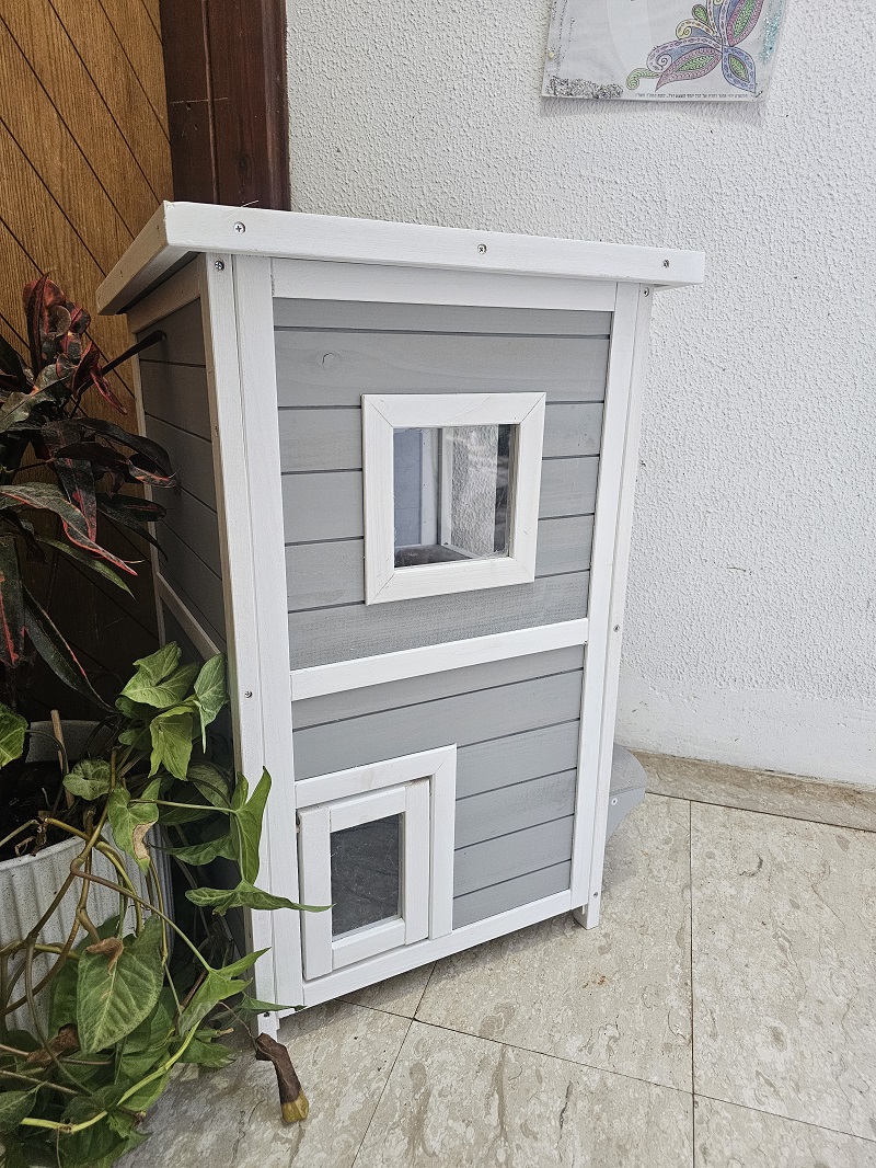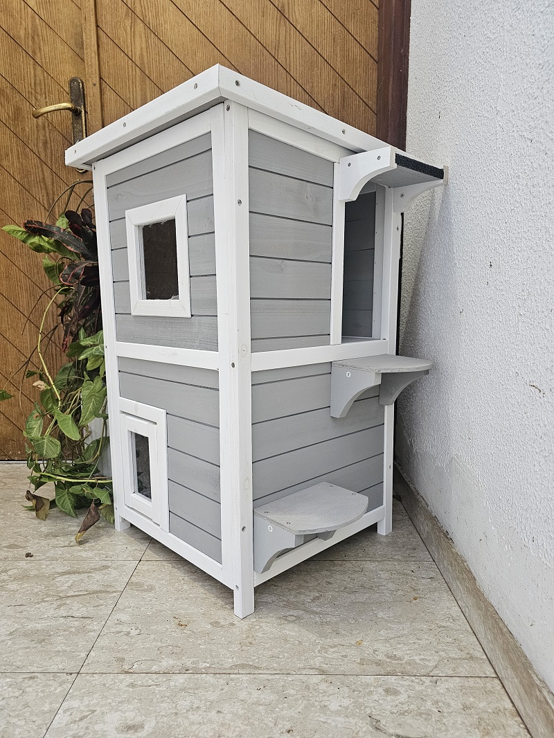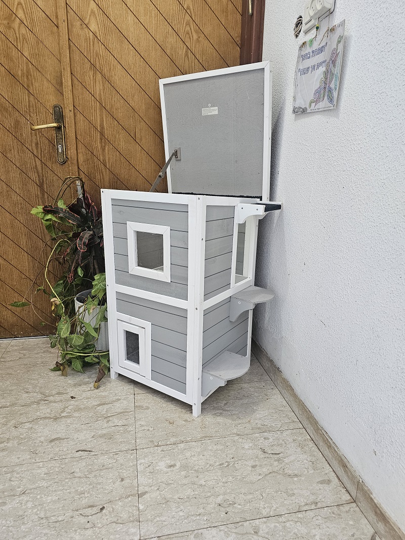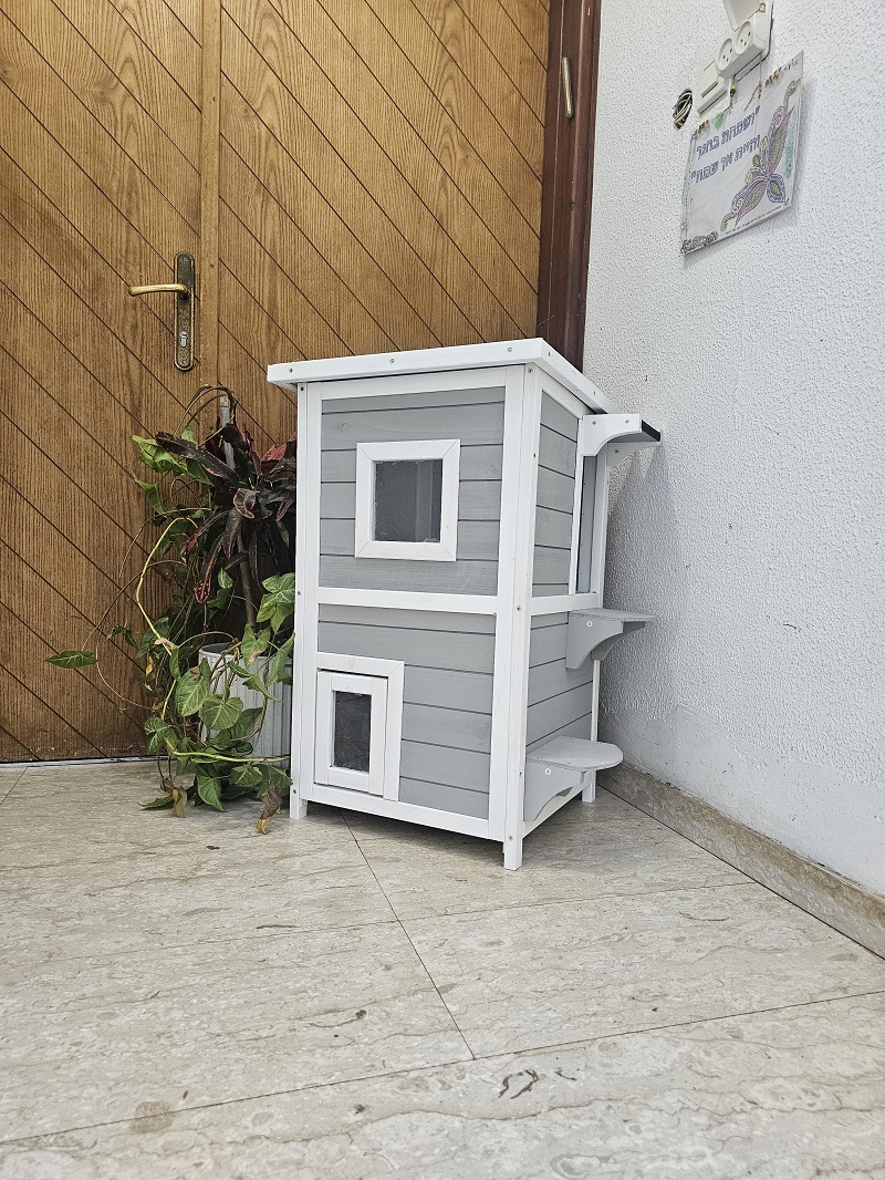 מאפיינים: בית חתולים מפנק בעל שתי קומות. משמש כמחסה וכפינת האכלה ורביצה נוחה. בנוי מעץ אורן מטופל וצבוע.